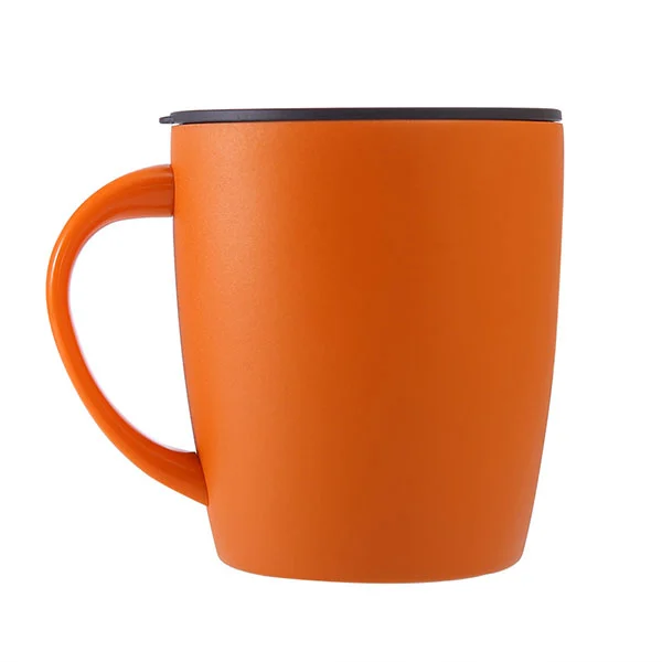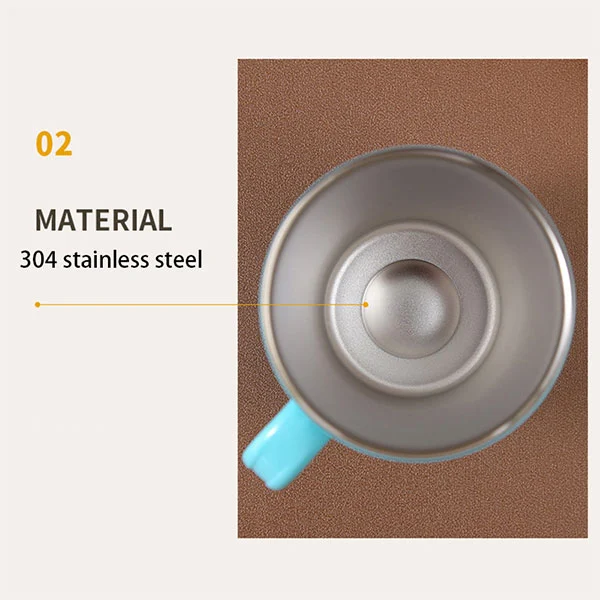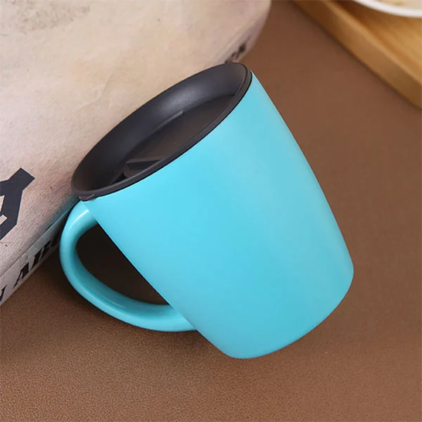 Jedná se o trendový hrnek na kávu z nerezové oceli s víkem, zaoblený vzhled, nechte si udržet dobrou náladu, umístěnou na stole, je také uměleckým dílem.