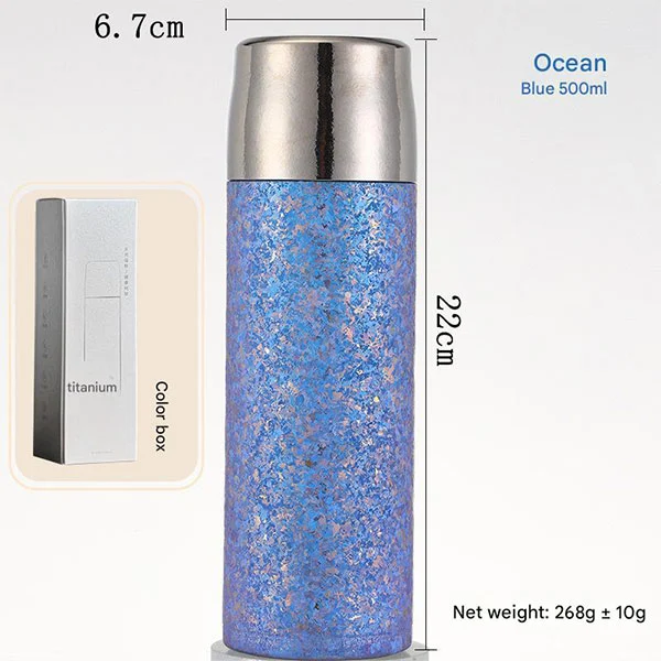 Tato titanová láhev s nepropustným kelímkem je vyrobena z 99,9% čistého titanu! Bez chemického nátěru! Titan, který má dobrou biokompatibilitu a odolnost proti korozi, je lepší než běžné materiály, jako je hliník, plast, sklo a nerezová ocel. Je netoxický, bezpečný a zdravý a nepřidává žádnou chuť ani vůni potravinám ani nápojům. Jeho znovupoužitelná povaha vás může provázet mnoho let.